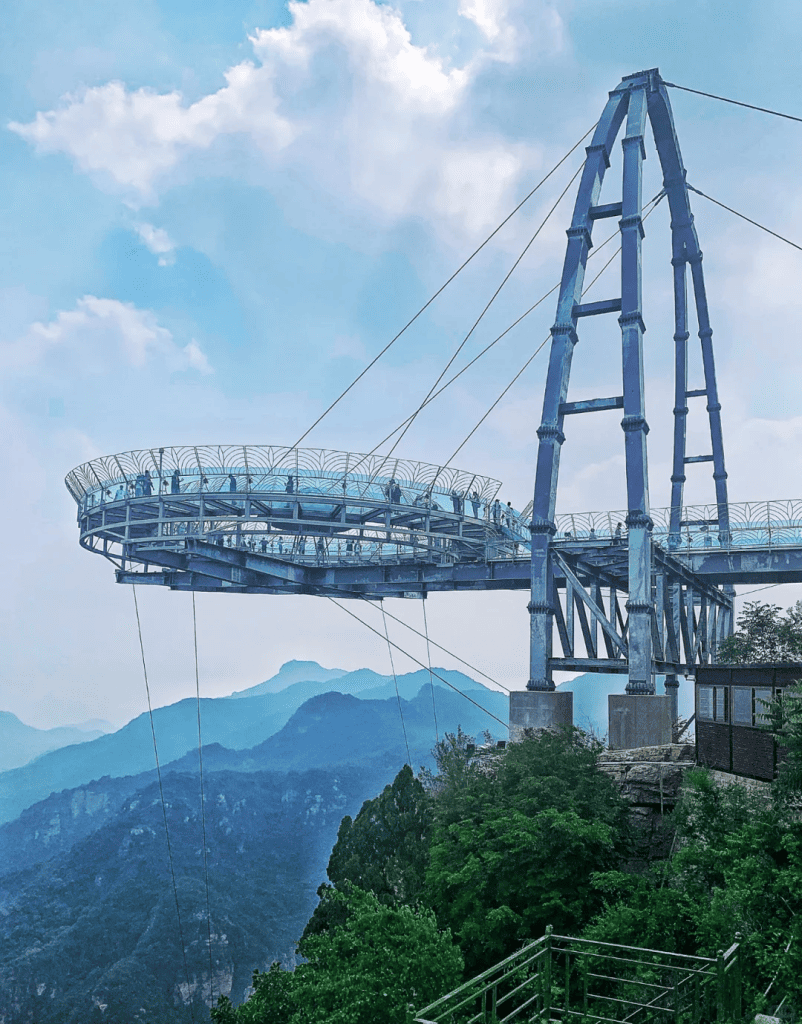 Художественное сооружение из стекла и титана с подвесным пролетом 32,8 м на 11,4 м; платформа выступает на 33 м над 400‑метровой пропастью и является одной из крупнейших в мире — ощущение парения и панорамы, которые запомнятся надолго.